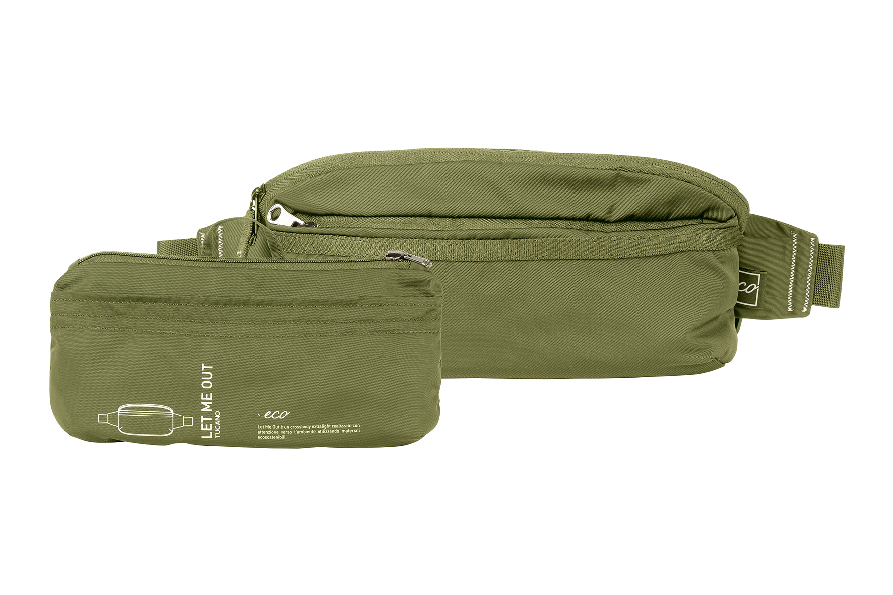 - Виготовлена з тканини з переробленого пластику, надлегка і складна сумка через плече, зовнішня кишеня та регульований поясний пасок