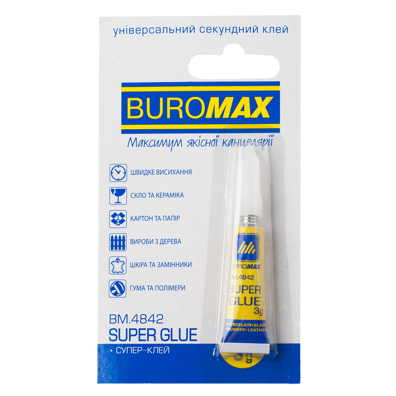 Універсальний супер-клей BUROMAX стане незамінним помічником. Підходить для повсякденного використання в офісі, для творчості чи робіт по дому. Характеристики: