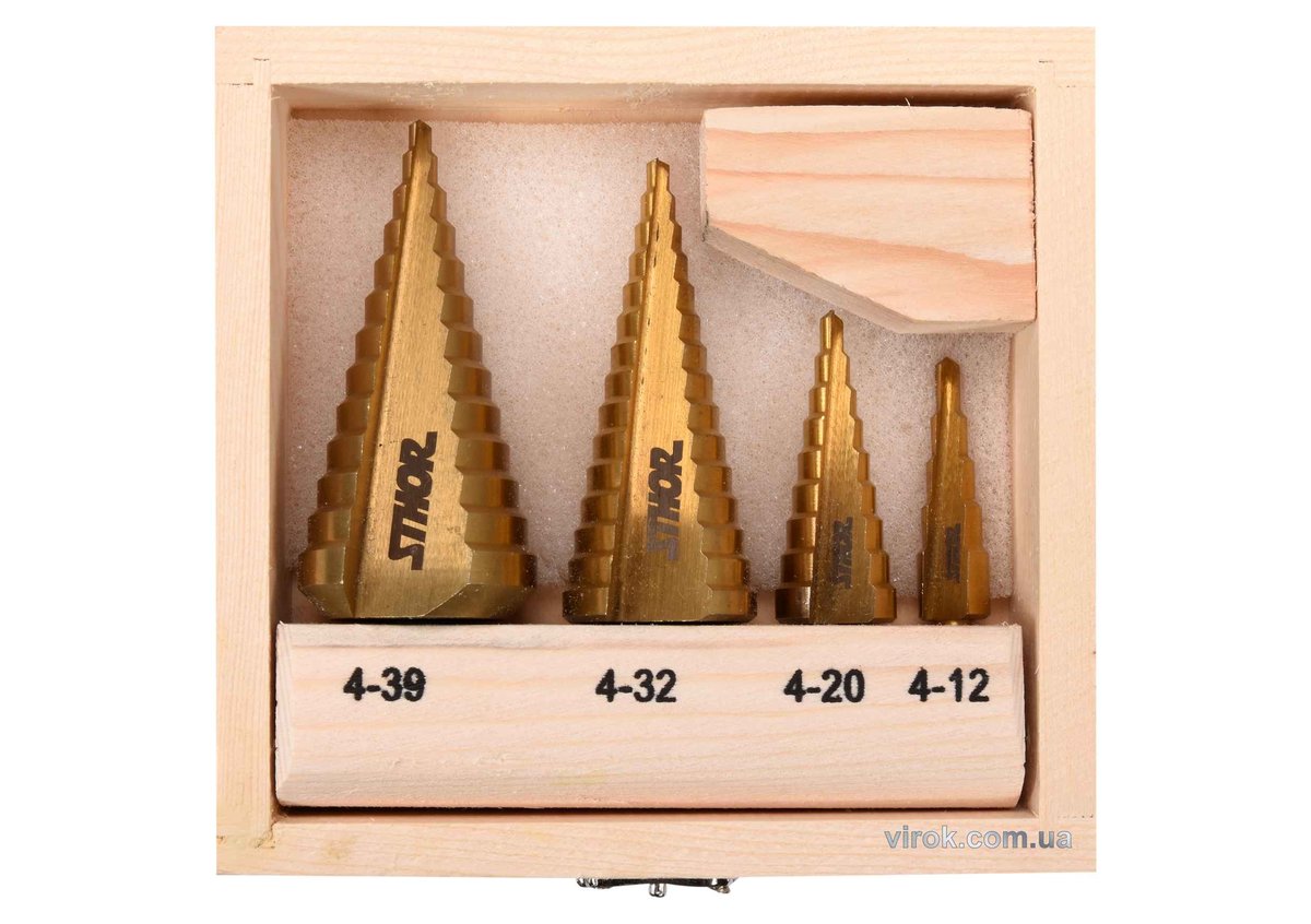 Опис Свердла конічні ступінчасті титанові по металу STHOR: Ø=4-39мм, HSS 4241, 4шт. в дерев. футлярі [20] код товару 22617