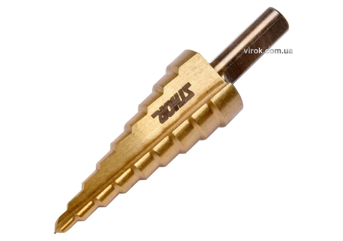 Опис Свердло конічне ступінчасте титанове по металу STHOR : Ø= 4-20 мм HSS 4241,[25/100] код товару 22611