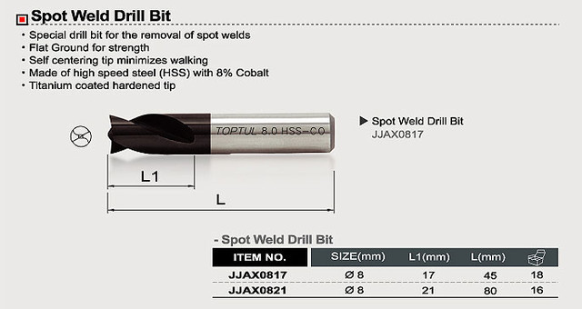 Опис Сверло 8 мм, L 80 мм для висвердлювання точкової зварки TOPTUL (JJAX0821) код товару JJAX0821