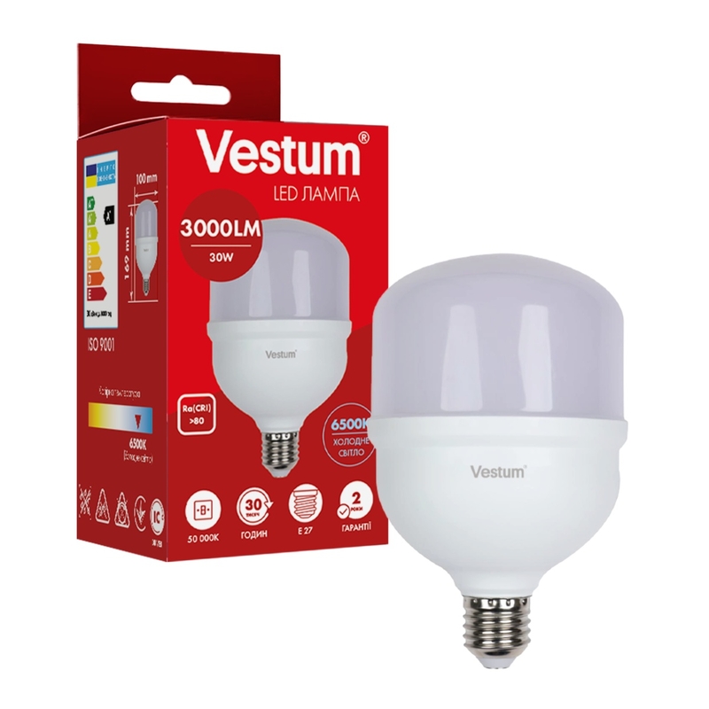 Світлодіодна високопотужна лампа Vestum 1-VS-1608 на 30 Вт видає 3000 Лм. Споживаючи в рази менше електрики, ніж лампи розжарювання або люмінесцентні лампи, вона дає таку ж кількість світла і прослужить в кілька разів довше. Лампа має холодне світло, що робить її придатною для промислових приміщень і вуличних світильників. У лампі використовується стандартний цоколь Е27. IC-драйвер забезпечує стабільну роботу лампи в широкому діапазоні напруги, 175-265 В, і запобігає пульсаціям. У лампі використовуються світлодіоди Epistar, що забезпечують високу енергоефективність і тривалу, безперебійну роботу. Переваги високопотужної лампи Vestum: Стабільна робота в широкому діапазоні напруги 175-265 В. Ресурс роботи - 30 000 годин. Широкий кут розсіювання світла.