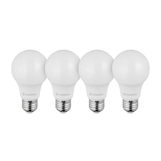 Опис Лампи світлодіодні набір з 4 штук LL-0014, LED A60, E27, 10 Вт, 150-300 В, 4000 K, 30000 годин, гарантія 3 роки INTERTOOL LL-4014 код товару LL-4014
