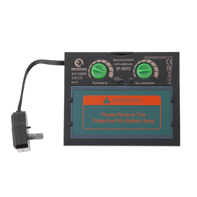 Світлофільтр до маски зварника Хамелеон INTERTOOL SP-0072. Призначений для захисту зорових органів під час зварювальних робіт. Виготовлений із спеціального матеріалу. Змінює ступінь затемнення автоматично. Діапазон затемнення - від 4 до 13 DIN. Чутливість сенсорів регулюється. Включення відбувається миттєво. Є режим затримки. Час затримки налаштовується. Лінзи – многошарове покриття. Збільшена стійкість до механічних пошкоджень. Розміри - стандартні для масок. Вага - легка, не перевантажує голову. Установка - проста, без додаткових інструментів. Сумісність з більшістю масок. Вимоги до експлуатації - температура від -5 до +55 градусів Цельсія. Не підлягає ремонту. Термін служби обмежений. Зберігати в сухому місці. Не піддавати впливу агресивних хімікатів. Сертифікація - відповідає стандартам безпеки. Користуватися згідно інструкції.