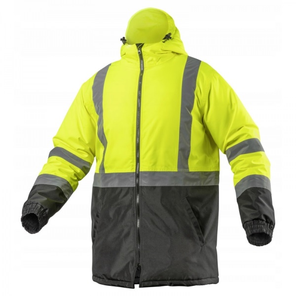 Сучасна чоловіча утеплена парку підвищеної видимості. Дві світловідбиваючі стрічки навколо плечей і рукавів і одна світловідбиваюча стрічка навколо тулуба. Виготовлений із матеріалів найвищої якості. Забезпечує максимальний комфорт та захист від холоду та вітру. Захищає від дощу (водонепроникність 2000 мм H₂O). Підвищує безпеку в умовах поганої видимості, наприклад, під час роботи вночі та в поганих погодних умовах, таких як дощ або туман. Особливо рекомендується восени та взимку. Жовта колірна схема продукту призначена для галузей, де робітники повинні бути добре помітні, у тому числі для тих, хто будує дороги, вулиці, рафінери, працює в морських портах, на нафтових вишках, у шахтах, аеропортах та в гірничо-рятувальних службах .