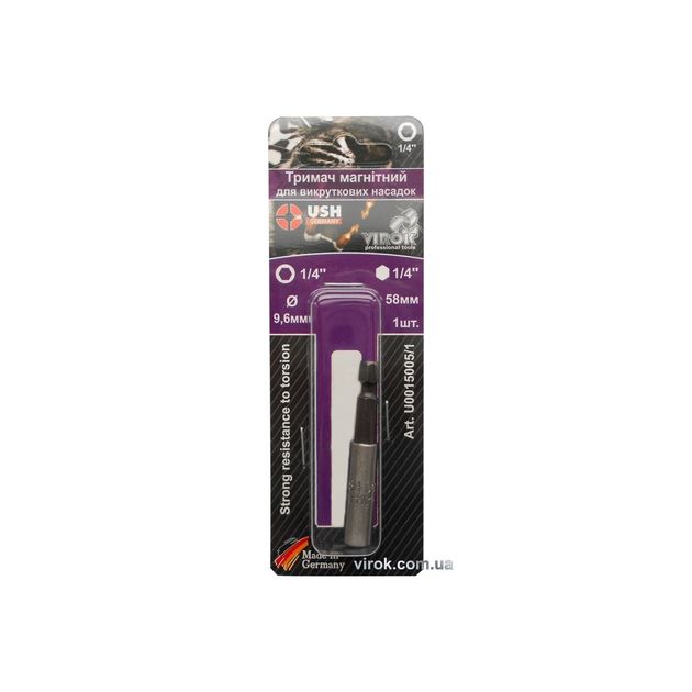 Характеристики Тримач магнітний насадок викруткових USH 1/4", L=58 мм, з кільцем, зовн. Ø=9,6 мм, уп. 1 шт. блістер код товару U0015005/1