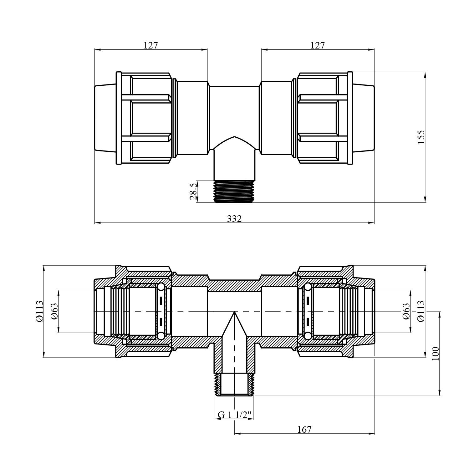 Характеристики Тройник ПЕ STR 63х11 1/2х63 РН код товару CV028649