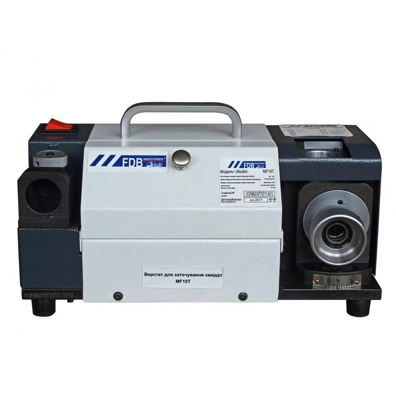 Модель настільного верстата для заточування свердлів FDB Maschinen MF10T має дуже малі габарити, що дозволяє помістити її на будь-якій стійкій поверхні у будь-якому місці в цеху або майстерні, де є електроживлення 220 В.Електродвигун, потужністю 180 Вт при 5 300 оборотів в хвилину, цілком достатньо, щоб якісно і точно виконувати заточування свердел діаметром від 2х до 13 мм. На верстаті застосовано алмазне коло, що легко справляється із заточенням свердла.Верстат FDB Maschinen MF10T найчастіше використовується для заточування спіральних свердлів з конічним хвостовиком, спіральних свердлів з циліндричним хвостовиком та спіральних гвинтових свердлів.На цьому верстаті можливе заточування свердел діаметром від 2 мм. до 13 мм. під кутами 90 - 135 градусів. Це можливо завдяки набору цанг, що додається до верстата. Саме завдяки тому, що заточування свердлів виконується шляхом затиску свердла в цанговий патрон, на заточному верстаті, можливо, виконати заточування кромки свердла, задньої поверхні і зменшити товщину поперечної кромки (перемичку).