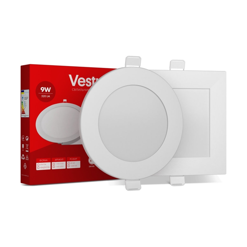 Круглый светодиодный светильник Vestum 1-VS-5108 мощностью 9 Вт дает 720 Лм света. Потребляя в разы меньше электричества, чем лампы накаливания или люминесцентные лампы, светильник дает такое же количество света и прослужит в несколько раз дольше. Панель с помощью клипс устанавливается в подготовленное заранее отверстие. Благодаря конструкции панель имеет низкий уровень бликов согласно стандарту UGR19. Светильник имеет влагозащиту IP20 и рекомендуется к установке в помещении. IC-драйвер обеспечивает стабильную работу светильника в широком диапазоне напряжения, 175-265 В, и предотвращает пульсацию. Драйвер изолирован, в случае поломки его легко заменить. В светильнике используются светодиоды Epistar, обеспечивающие высокую энергоэффективность и длительную бесперебойную работу. Преимущества LED панелей Vestum: Быстрый монтаж. Низкий индекс бликов UGR19. Драйвер с универсальным соединением. Стабильная работа в широком диапазоне напряжения 175-265В.