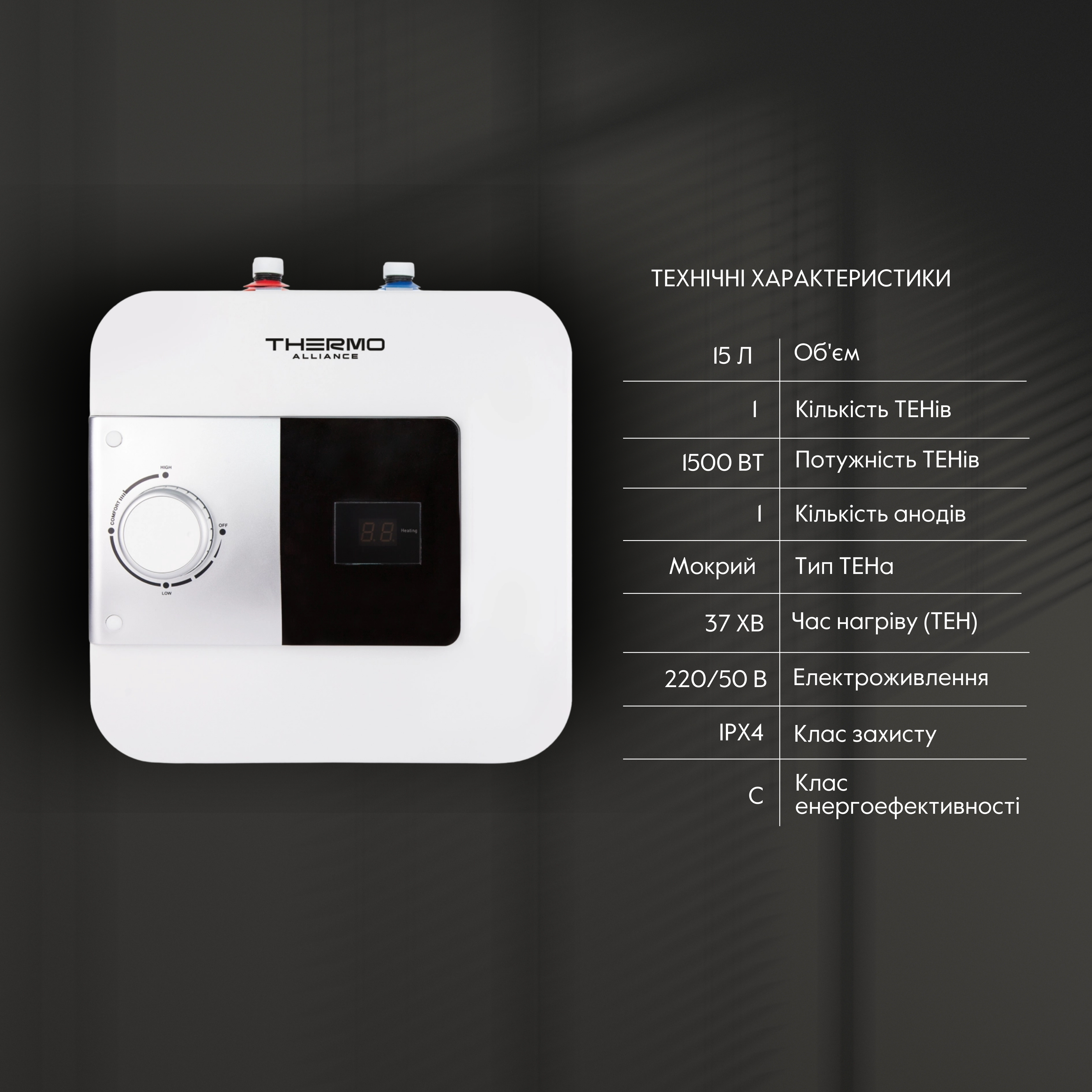 Характеристики Водонагрівач електричний Thermo Alliance 15 л під мийку вертикальний, мокрий ТЕН 1,5 кВт SF15S15N код товару SD00036046