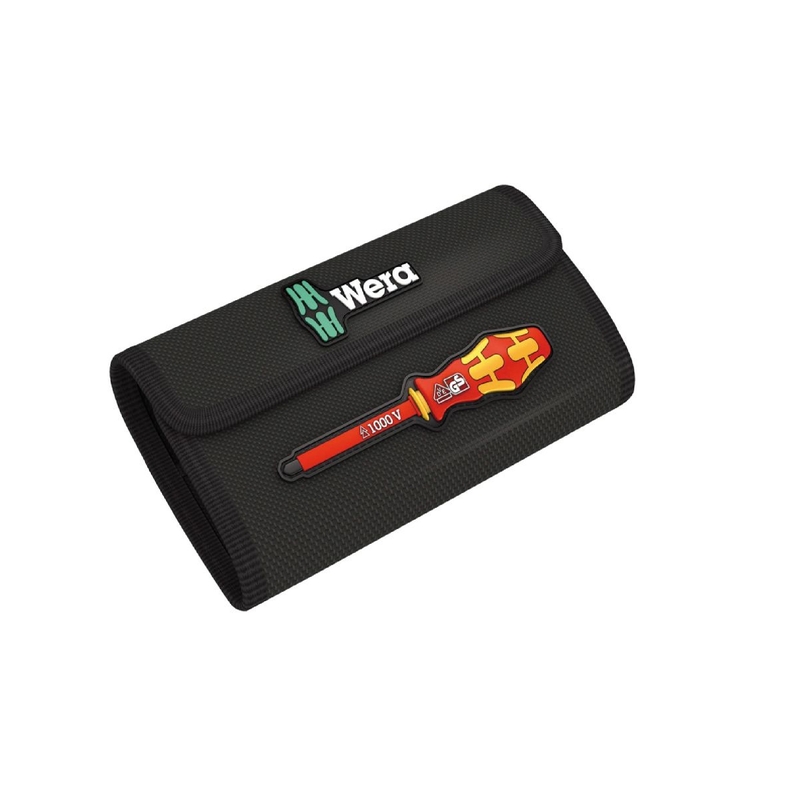 14 сменных отверток VDE с ручкой-держателем 817 VDE Kraftform и индикатором напряжения в прочной поясной сумке. Инструменты проверены поштучно по стандарту IEC 60900. Поштучная проверка в водяной бане под напряжением 10000 В для безопасной работы на оборудовании с максимально допустимым напряжением 1000 В.