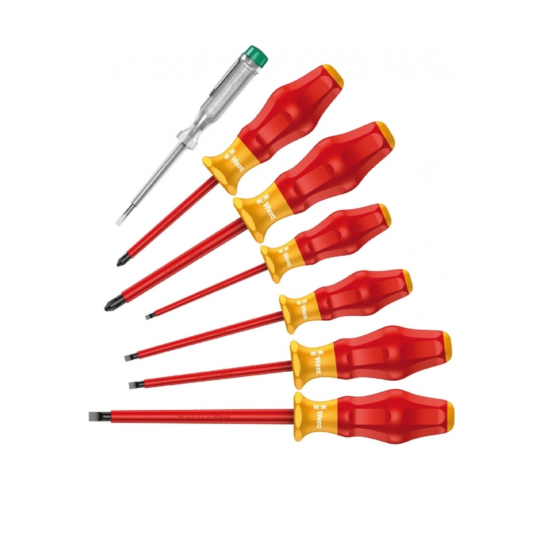 Набор высококачественных отвёрток Kraftform Comfort. Многокомпонентная ручка Kraftform для работы в быстром и щадящем режиме. Наконечник Wera Black Point и трудоёмкий процесс закалки обеспечивают долгий срок службы наконечника, повышенную защиту от коррозии и точность работы. Поштучная проверка в водяной бане под напряжением 10000 В для безопасной работы на оборудовании с максимально допустимым напряжением 1000 В. Шестигранный край ручки предотвращает надоедливое перекатывание отвёртки на рабочем месте. С маркировкой ручки для облегчённого отбора и сортировки инструментов. Набор включает индикатор напряжения.