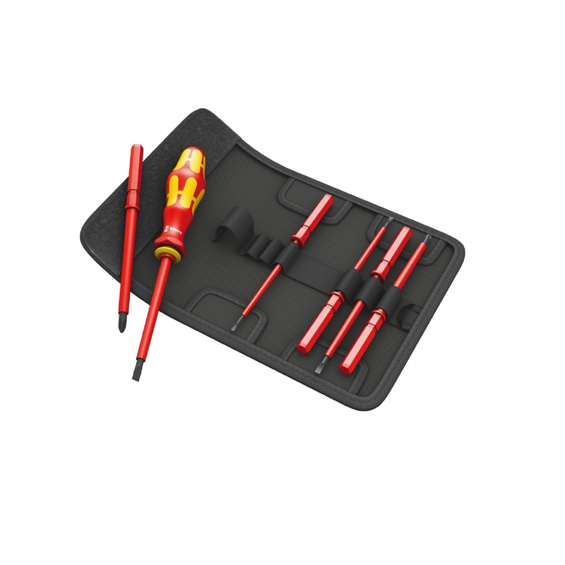 6 сменных отверток VDE с ручкой-держателем 817 VDE Kraftform в прочной поясной сумке. Инструменты проверены поштучно по стандарту IEC 60900. Поштучная проверка в водяной бане под напряжением 10000 В для безопасной работы на оборудовании с максимально допустимым напряжением 1000 В.