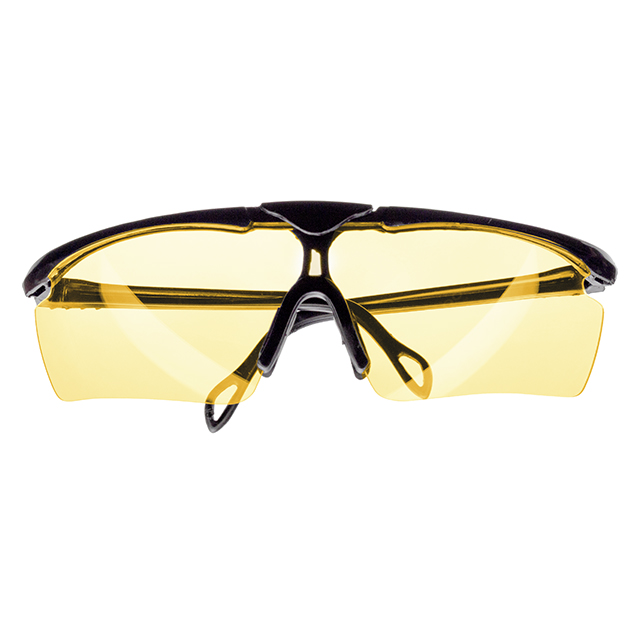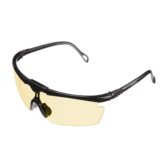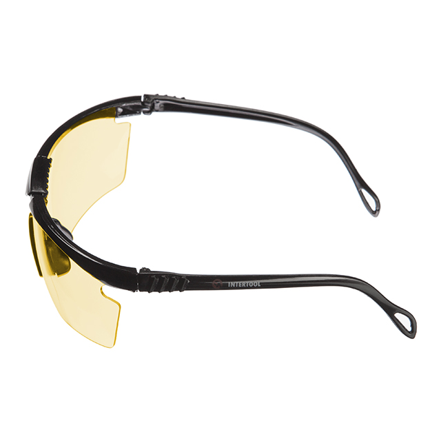Опис Очки захисні жовті INTERTOOL SP-0091, матеріал лінз PC, матеріал заушників PC чорного кольору, протиударні, оптичний клас 3 код товару SP-0091