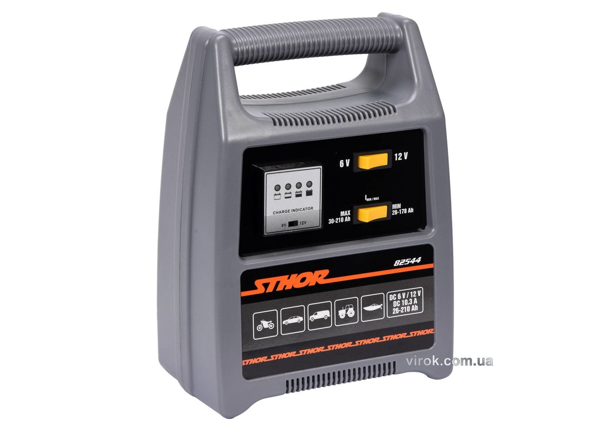 Характеристики Зарядний пристрій для акумуляторів 6-12 В STHOR від електромережі 230 В, з ємністю 26-210 Ач, макс. струм 12 А (VO-82544) код товару 82544