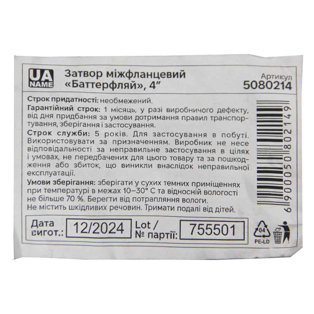Опис Затвор межфланцевый «баттерфляй» 4'' корпус чугун (GGG50) диск чугун (GGG50) EPDM PN16 FLORA (5080214) код товару 5080214