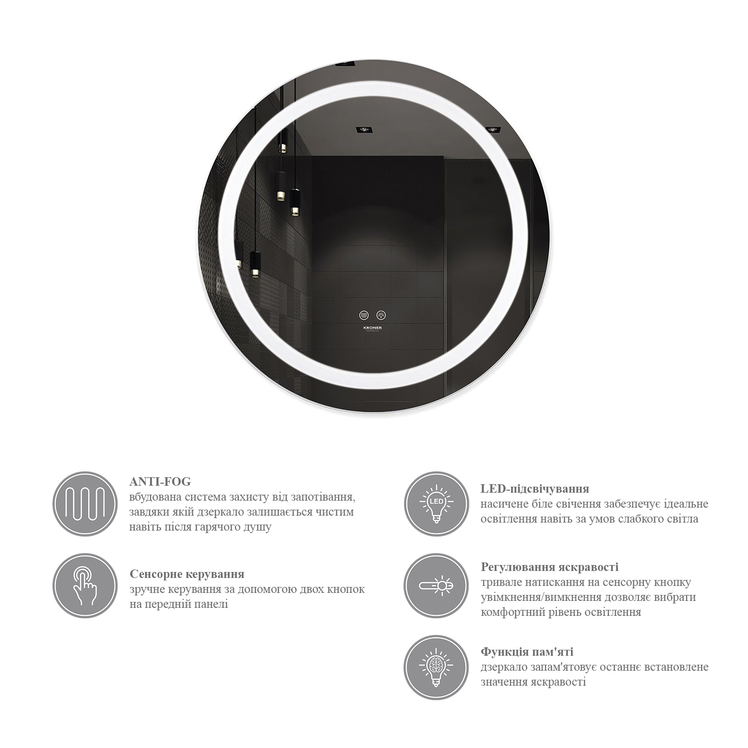 Характеристики Зеркало Kroner KRP Spiegel R2 - 6060 з LED-підсвіткою та антизапотіванням код товару CV030042