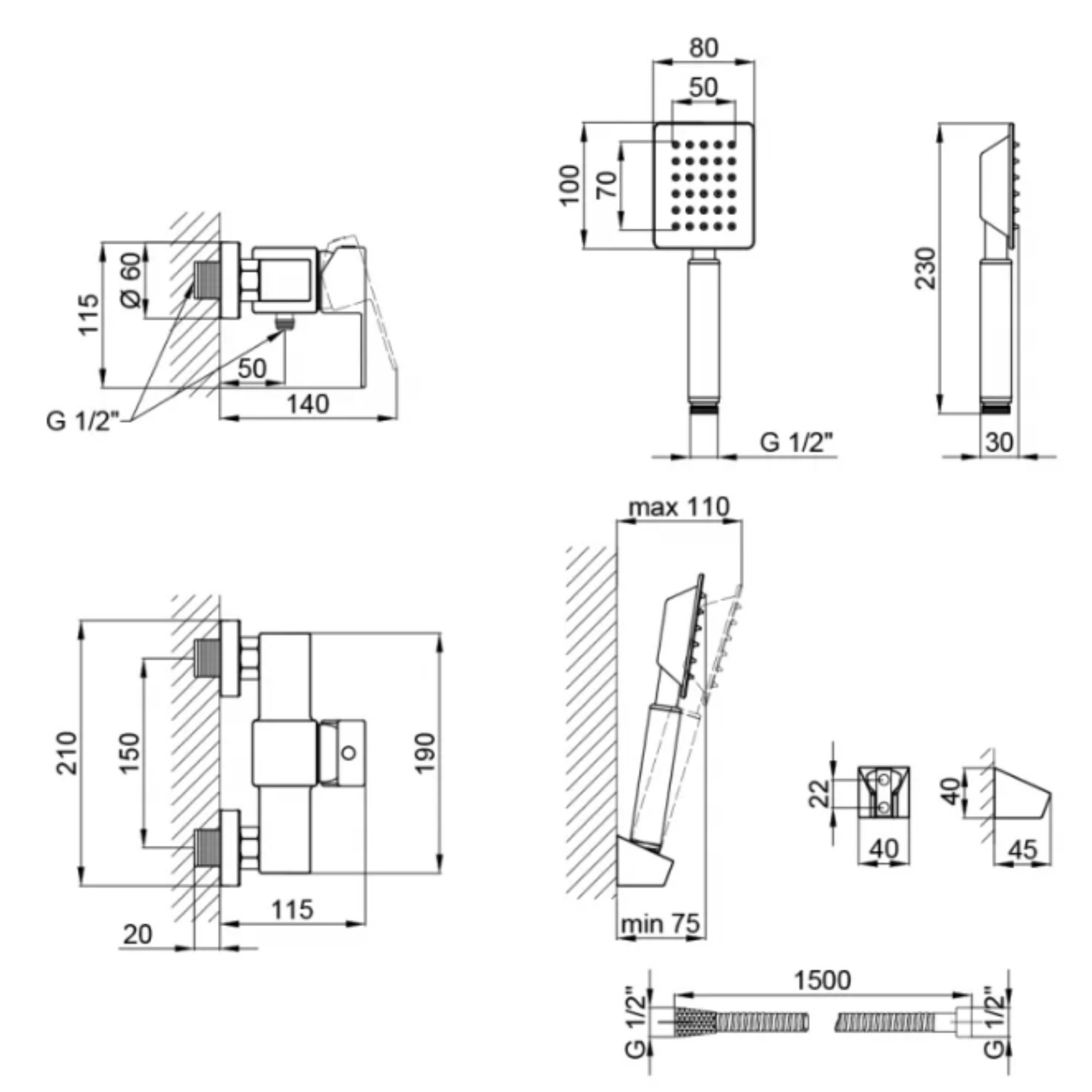 - Нержавіюча сталь AISI 304. Лійка (ВхШ) 230х80 мм. Кількість форсунок 30 шт. Довжина душового шлангу – 1500 мм.