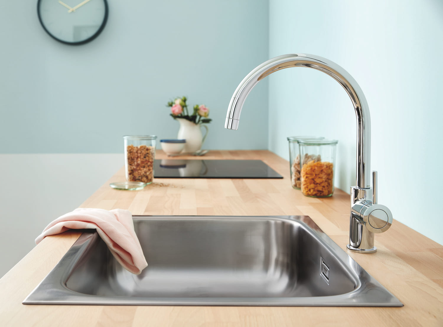 Змішувач Grohe BauClassic - ідеальний вибір для сучасних кухонь. Завдяки високому виливу довжиною 223мм та поворотному дизайну забезпечує зручність використання. Одноручний важіль управління забезпечує легке регулювання температури та потоку води.