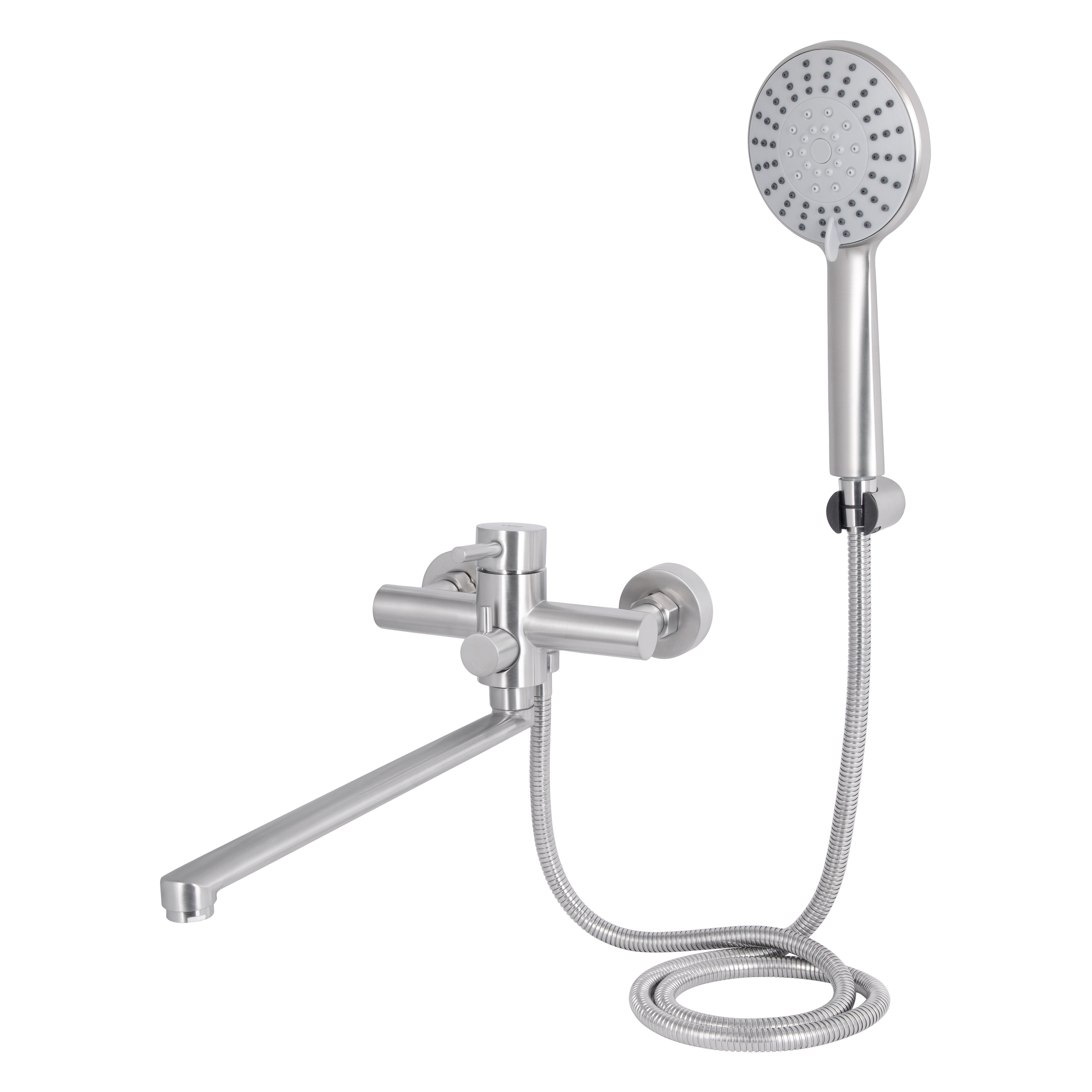 - Нержавіюча сталь AISI 304. Діаметр лійки: Ø 100 мм. Довжина душового шланга – 1500 мм. Висота лійки: 233 мм.
