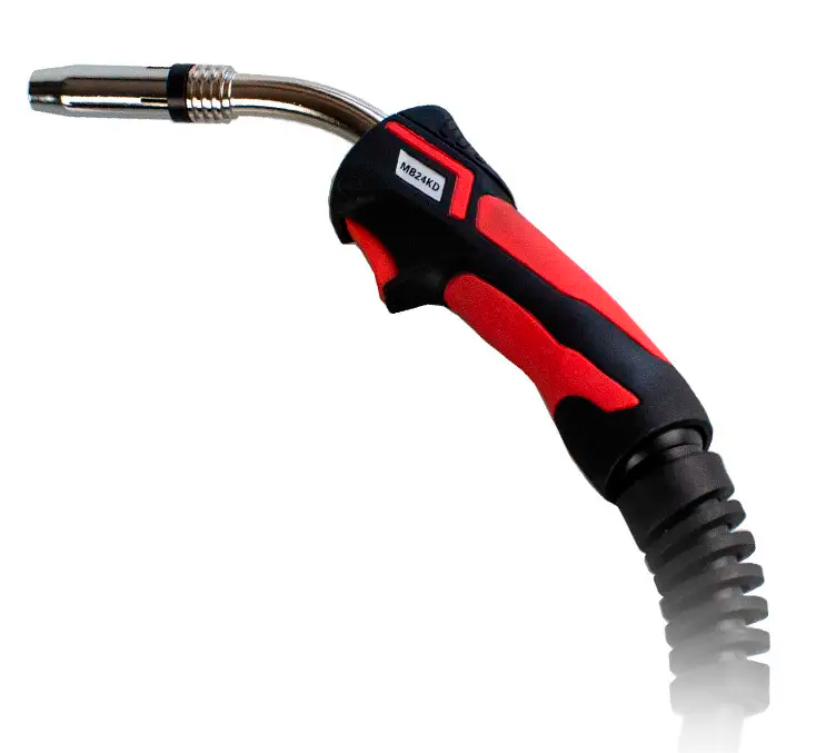 MB-24KD Welding Dragon - класичний пальник для напівавтоматичного (MIG/MAG) зварювання в середовищі захисного газу. Він відрізняється невеликими розмірами і зручний у використанні. Руків' я червоно-чорного кольору, подача газу і дроту керується вбудованою кнопкою. Це пальник, що йде наступним у серії за MB-15AK Welding Dragon, він більш потужний і більший за габаритами, але при цьому залишається компактним і зручним для роботи. За конструкцією MB-24KD Welding Dragon здатен витримати більш високий струм і вже належить до класу виробничих, а не побутових пальників. Охолоджується пальник повітрям, а це значить, що немає необхідності для зварювальних робіт купувати додатково блок рідинного охолодження. Пальником MB-24KD Welding Dragon можна укомплектувати практично будь-який зварювальний напівавтомат вітчизняного або закордонного виробництва, номінальний зварювальний струм якого не перевищує 320А, а підключення здійснюється за допомогою роз' єму KZ-2. Пальник випускається з довжиною шланг-пакету 5 метрів. Комплектуючі для MB-24KD Welding Dragon повністю сумісні з поширеними запасними частинами для пальників Abicor Binzel (серія MB-24), TBi (серія TBi-240) та подібних їм.