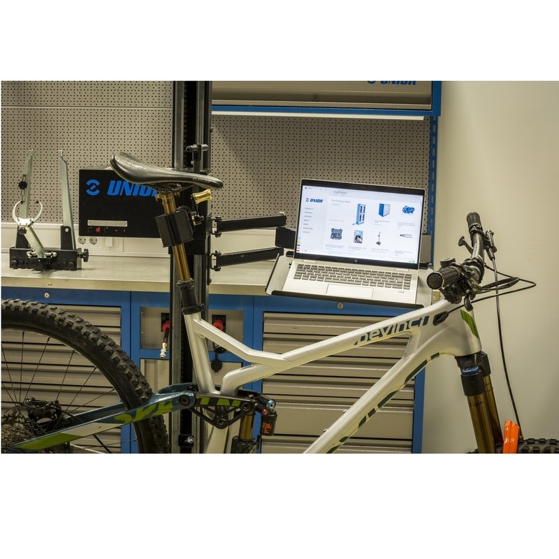 Складной держатель для ноутбука крепится к колонке электрического ремонтного стенда Union и обеспечивает оптимальное размещение ноутбука. Настройка сделает работу более комфортной и продуктивной, поскольку компьютер будет находиться там, где вам это нужно, и вам не придется обращаться к верстаку, чтобы получить к нему доступ. Лоток достаточно большой, чтобы поддерживать ноутбуки размером до 15˝ и может вращаться на 90 градусов влево или вправо. Складной кронштейн имеет длину 500 мм и позволяет разместить ноутбук за велосипедом, ближе к вам, или сдвинуть его с рабочей зоны, когда он не используется.