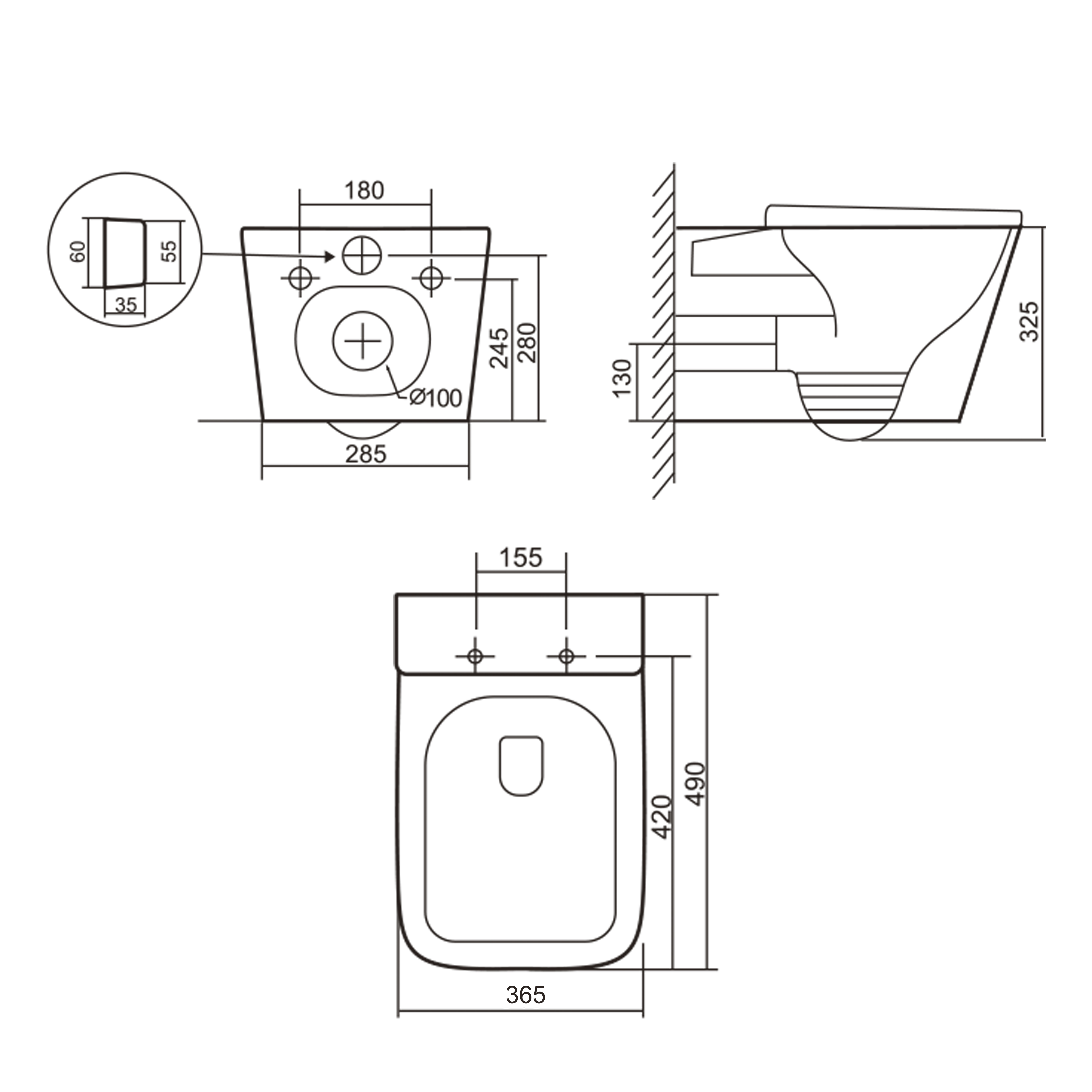 Одно отверстие справа у края безободковой чаши с технологией смыва Tornado 3