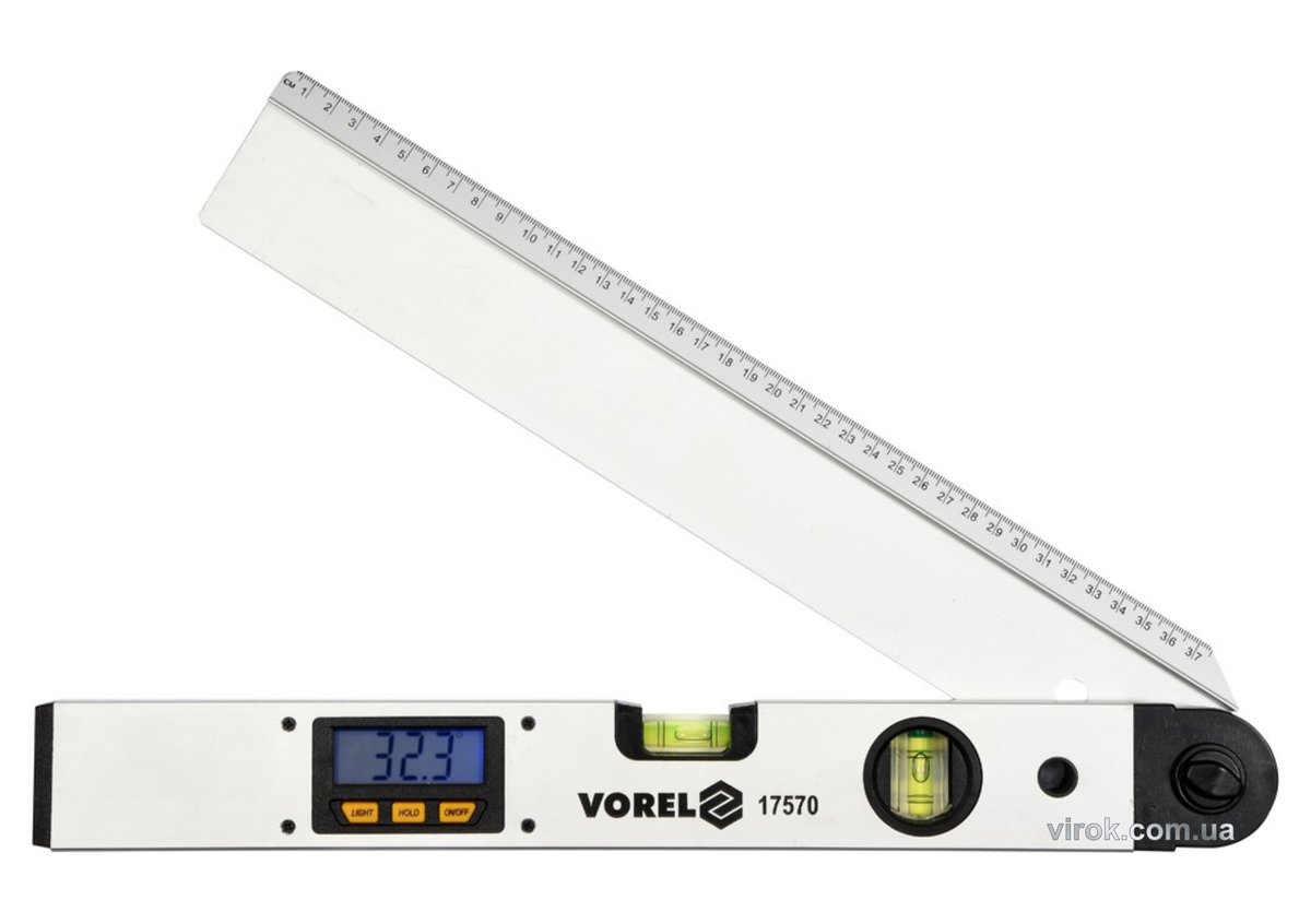 Характеристики Кутомір електронний VOREL 40 см, цифровий дисплей, 2 капсули код товару 17570