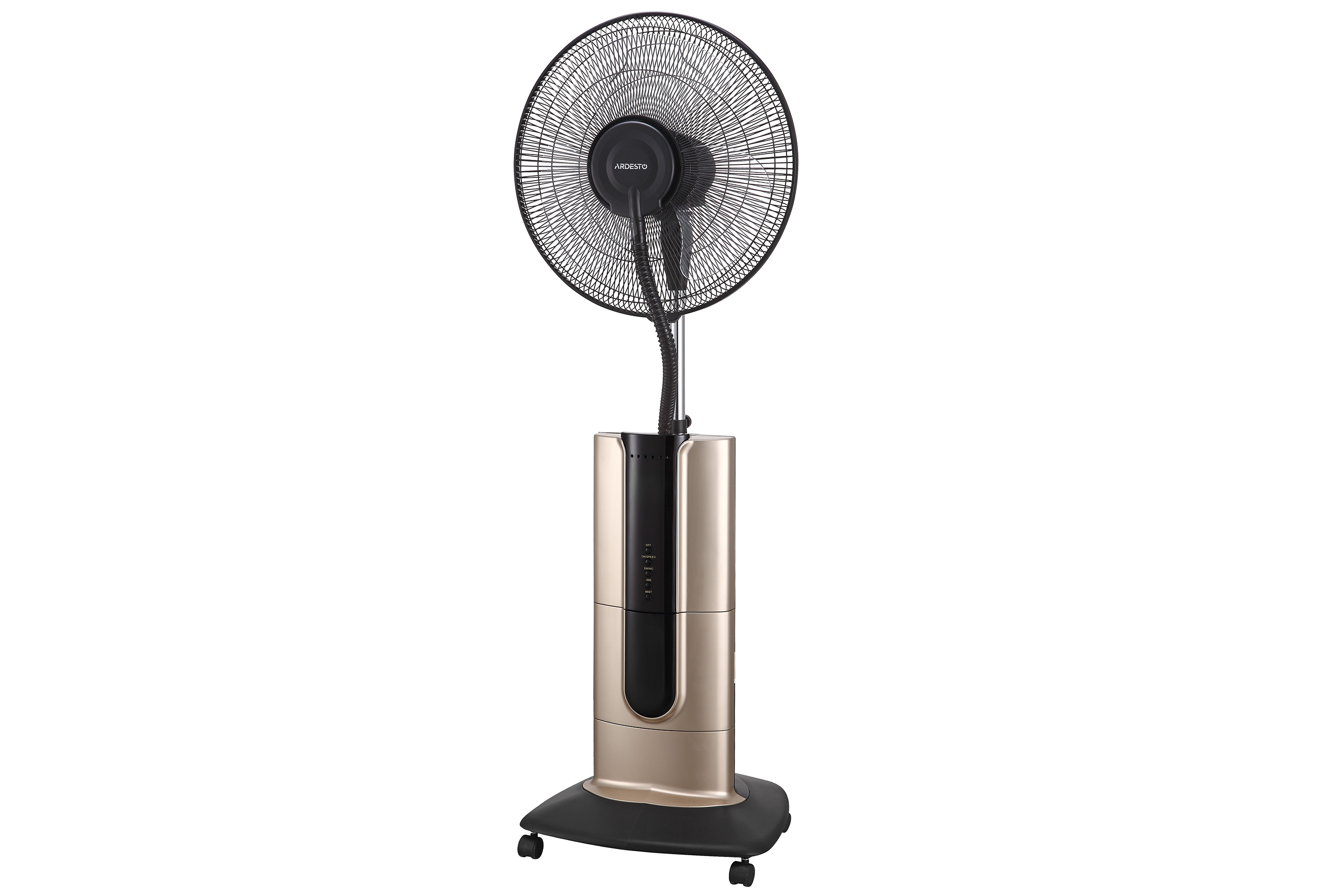 Вентилятор підлоговий золотистого кольору з функцією зволоження. Для зручного керування передбачено дисплей з кольоровою індикацією та пульт ДУ. Модель виконана з надійних, практичних і довговічних матеріалів, а в якості підставки використовується платформа з колесами.