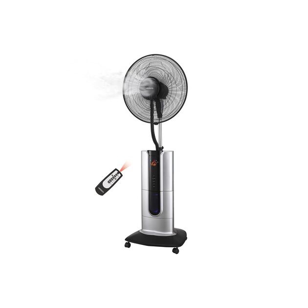 Вентилятор підлоговий сріблястого кольору з функцією зволоження. Для зручного керування передбачено дисплей з кольоровою індикацією та пульт ДУ. Модель виконана з надійних, практичних і довговічних матеріалів, а в якості підставки використовується платформа з колесами.