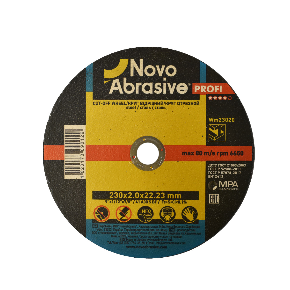 Характеристики Відрізний круг NovoAbrasive PROFI**** 41 14А 230 2,0 22,23 код товару 4015543