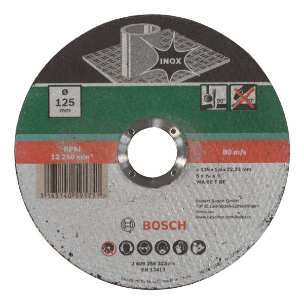 Характеристики Отрезной круг прямой, нержавеющая сталь, диам. 125 мм, толщина 1,6 мм BOSCH код товару 2609256323