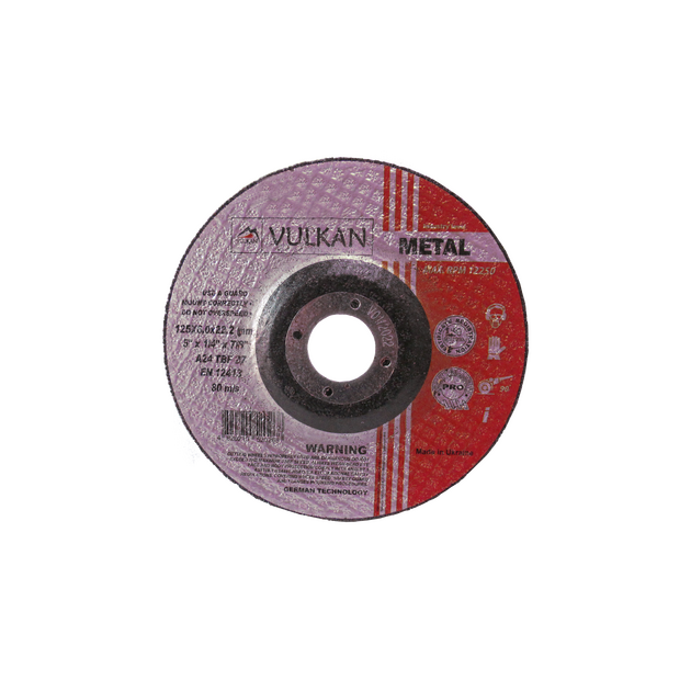 Круг зачисний Vulkan - абразивний круг, який застосовується для зачистки та шліфування металевих деталей, зварювальних швів або видалення задирок. Встановлюється на кутову шліфувальну машину з робочим діаметром 125 мм і частотою обертання до 12200 об / хв. Товщина кромки круга становить 6 мм, що дозволяє використовувати протягом довгого часу.