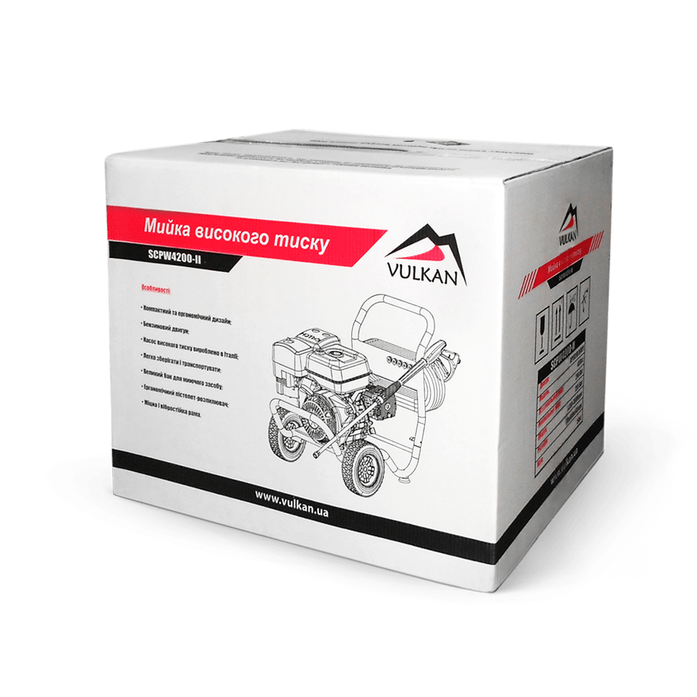 Мийка високого тиску Vulkan SCPW 4200-II - професійний мийний апарат на бензиновому двигуні потужністю 13 л. с. Дана модель активно використовується у сфері технічного обслуговування, на виробництві, в роботі комунальних служб і клінінгових компаній. Додатково мийку можна оснастити пінної насадкою або фрезу.