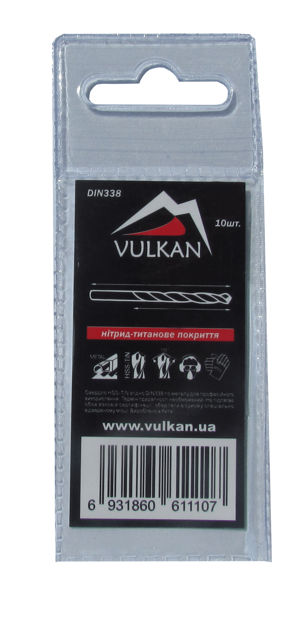 При виробництві спіральних свердл ТМ Vulkan використовується швидкорізальна сталь HSS, зі спеціально підібраним складом добавок, виготовлені згідно DIN 338. Свердло шліфоване з титаново- нітридним покриттям, має попит у виробничих підприємствах на лініях металообробки та в майстернях. Точно заточене свердло з різальною частиною типу А дозволяє швидко виконувати роботи по бурінню отворів в сталі, чавуні, кольорових металах (мідь, нікель, цинк, латунь), листовий метал, нержавіюча стала та пластик. Свердло із двома різальними кромками, циліндричне, двоканавкове з перехресним заточенням 135° (від 3 мм).
