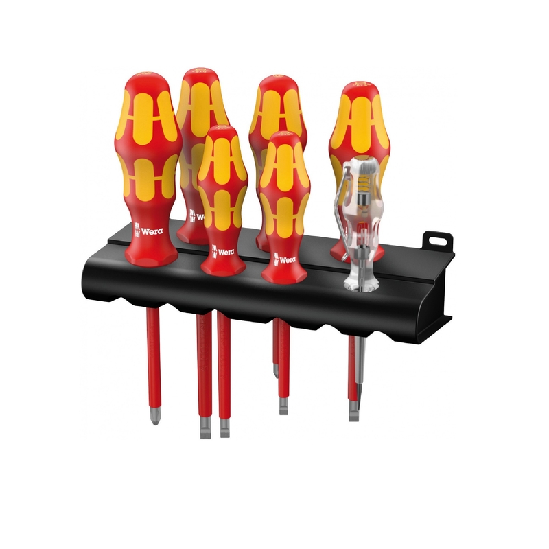 Набор электроизолированных отверток, 7 предметов, с поштучной проверкой по стандарту IEC 60900. Поштучная проверка в водяной бане под напряжением 10000 В для безопасной работы на оборудовании с максимально допустимым напряжением 1000 В. Ручка Kraftform Plus для комфортной работы без появления на руках мозолей и волдырей. Твердые зоны ручки для высокой скорости работы, в то время как мягкие зоны ручки обеспечивают передачу больших моментов силы. Часть отверток с обработкой Lasertip: наконечник надёжно „вгрызается“ в головку винта и предотвращает выскальзывание отвёртки. С индикаторами инструментов „Take it easy“: Цветовая маркировка профиля и гравировка размера. Шестигранный край ручки для защиты от перекатывания отвёртки на рабочем месте. Набор включает индикатор напряжения и подставку для размещения отвёрток.